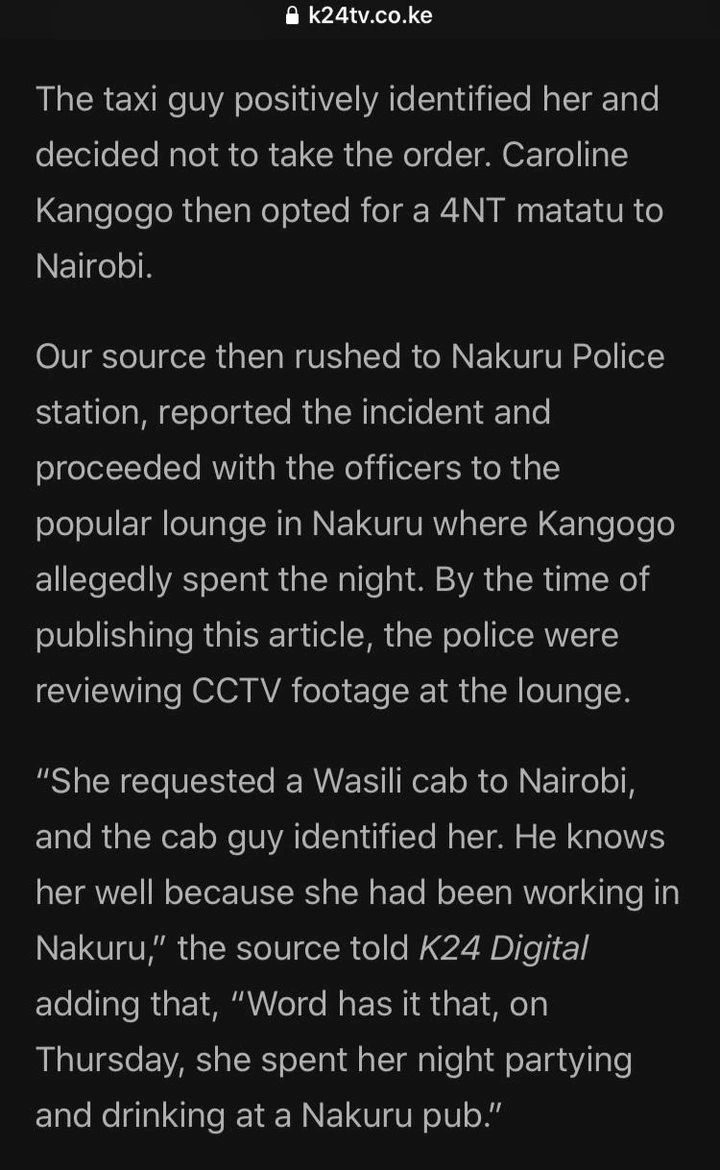 Fugitive police officer caroline kangogo has been found dead. Police intensify manhunt for caroline kangogo, a female police officer who murdered two people. Corporal caroline kangongo allegedly killed two men and she is currently at large. Cpl caroline kangogo invited her newly acquired unnamed boyfriend to her house in nakuru police lines. Before she was termed, 'rogue and dangerous,' she has been stationed at central police station in nakuru from 2015.